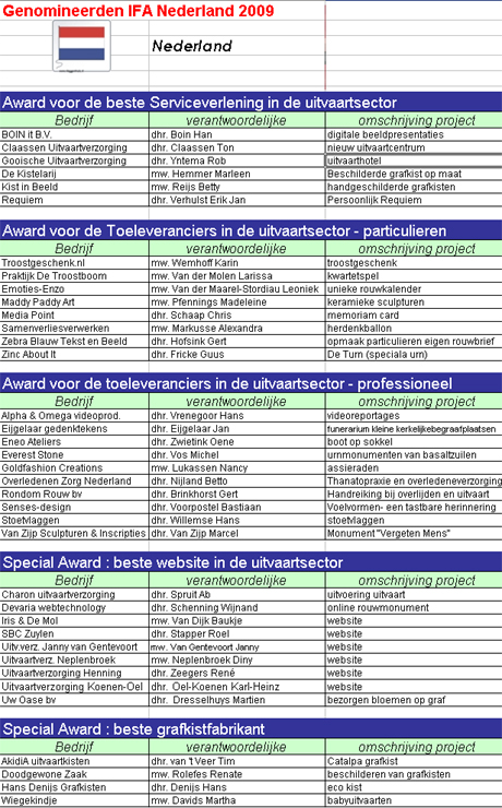 Zaterdag 12 september jl vond de nominatieronde plaats van de International Funeral Award. De bijeenkomst werd gehouden in Crematorium Dieren, dat dezelfde dag ook een Open Dag organiseerde. Op deze wijze konden bezoekers gelijk kennis nemen van innovaties in de uitvaartbranche, meende de organisatie. Dit jaar waren er in totaal 79 inschrijvingen. 41 hebben zich gepresenteerd tijdens de open juryday waarvan uiteindelijk de volgende 37 zijn genomineerd.