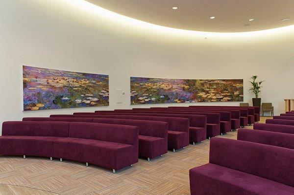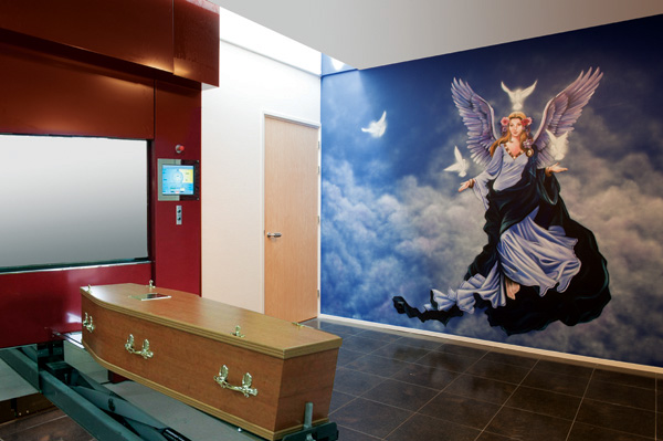 De ovenruimte is tevens ingericht als afscheidsruimte en biedt gelegenheid om de overledene tot het laatste moment te begeleiden. Een wandschildering, geeft deze ruimte een extra dimensie.