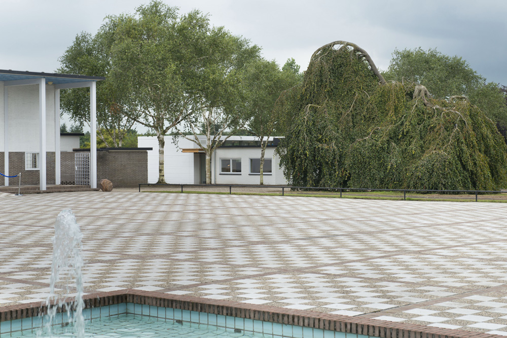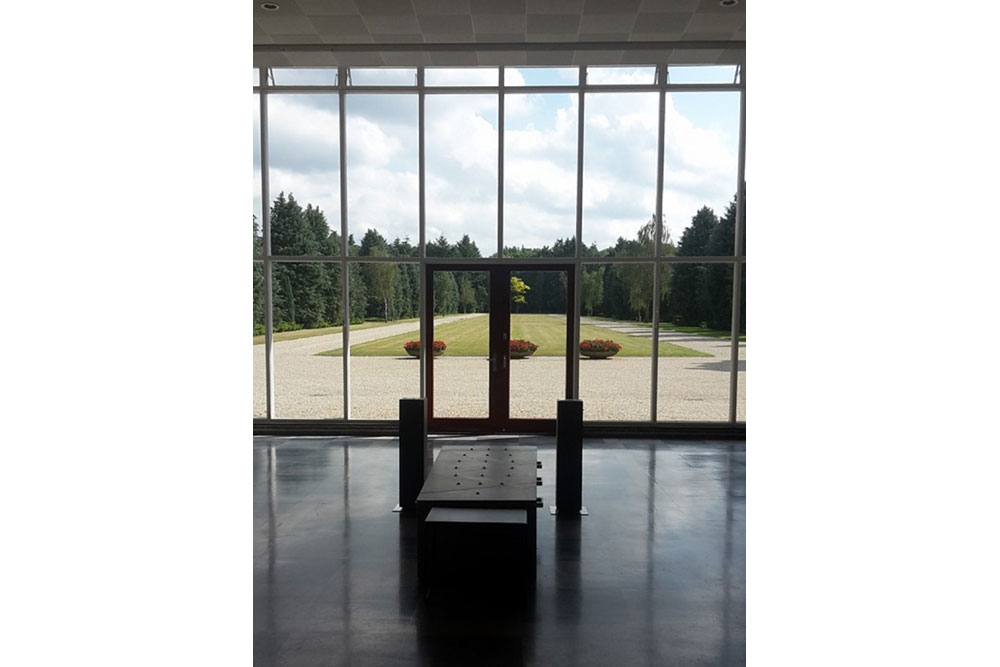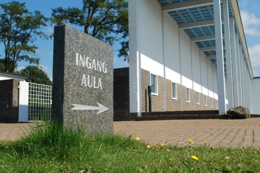 De aula biedt een vergezicht op de centrale groene middenas van de begraafplaats. Aan weerszijden liggen de grafvelden, omsloten door heesters en bomen die een intieme sfeer creëren.