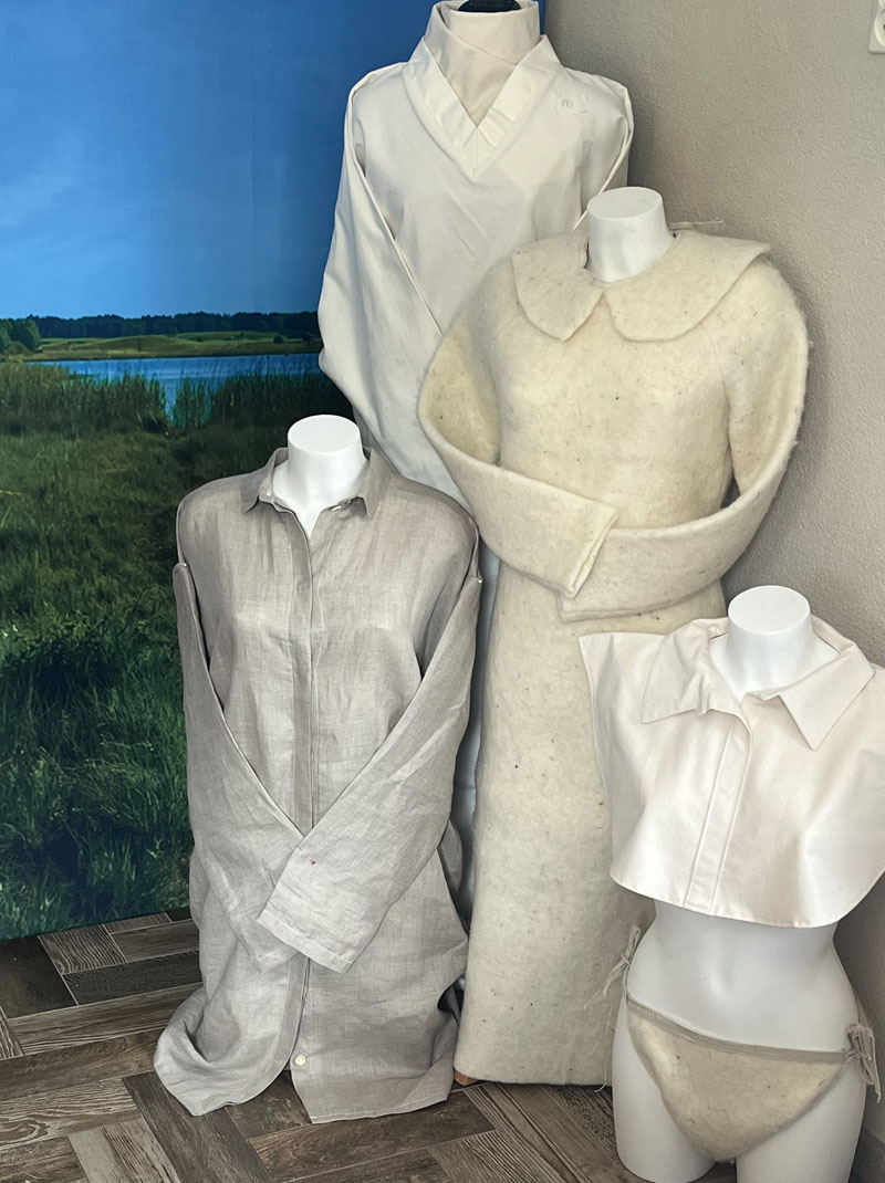 De materialen variƫren van katoen, linnen, hennep tot lokale Nederlandse schapenwol. In ons eigen naaiatelier ontwerpen en maken we de kleding, sokken en incontinentiemateriaal met de wades.