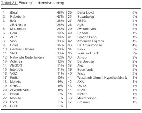 Bij de banken staat de internetafrekendienst iDeal op 1 met een score van 48 procent, gevolgd door Rabo (47%) en ING, die door 38 procent van de Nederlanders als onmisbaar wordt ervaren.