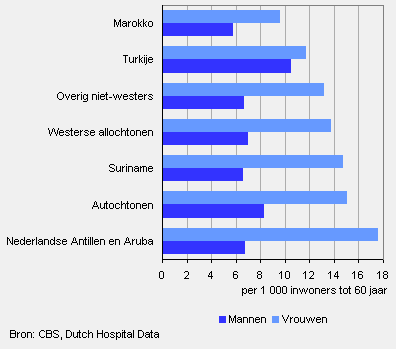 Het hogere aantal ziekenhuisopnamen bij Turken deed zich voor bij zowel mannen als vrouwen. Bij de Surinamers werden vooral de mannen vaker opgenomen.