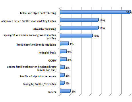 Wanneer mensen ingelicht worden over de reële totale kosten zegt slechts 35% van de ondervraagden de eigen uitvaart te kunnen financieren met de eigen bankrekening. 19% kan terugvallen op een uitvaartverzekering. 3% denkt beroep te moeten doen op het OCMW. De overige 43 % denkt te moeten terugvallen op familie.
