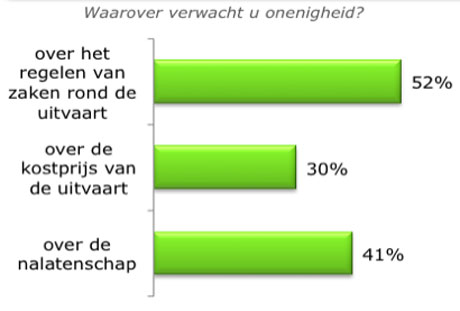 Uit het onderzoek blijkt dat 42% verwacht dat een toekomstig overlijden tot conflicten zal leiden in de familie. Deze conflicten worden voornamelijk verwacht op het vlak van het onderling praktisch regelen van de uitvaart zelf (52%) en/of over de nalatenschap (41%), 30% meent dat in de familie onenigheid zou kunnen ontstaan rond de kostprijs van de uitvaart.