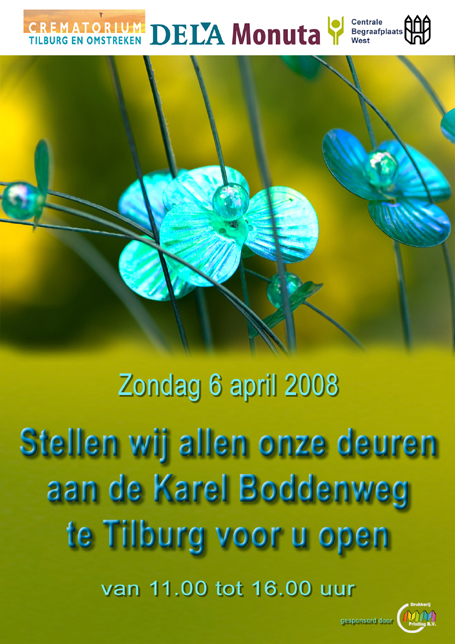 Tilburg, maart 2008 - Op zondag 6 april organiseren Dela, Monuta, Centrale Begraafplaats West en het Crematorium voor Tilburg en omstreken aan de Karel Boddenweg een uitvaartboulevard. Het klinkt in eerste instantie misschien best vreemd, toch is het niet zo raar. Sterven hoort bij het leven en vroeg of laat wordt iedereen ermee geconfronteerd. Daarom kan het juist enorm verhelderend werken om te weten welke mogelijkheden er zijn om van het laatste afscheid een unieke persoonlijke gebeurtenis te maken. We stellen ieder op onze eigen manier de deuren open van 11.00 tot 16.00 uur. Tijdens deze dag hebt u de kans om achter de schermen te kijken en alle vragen te stellen die u maar wilt.