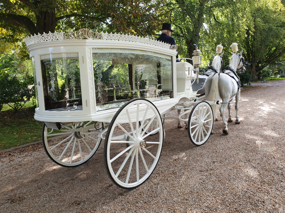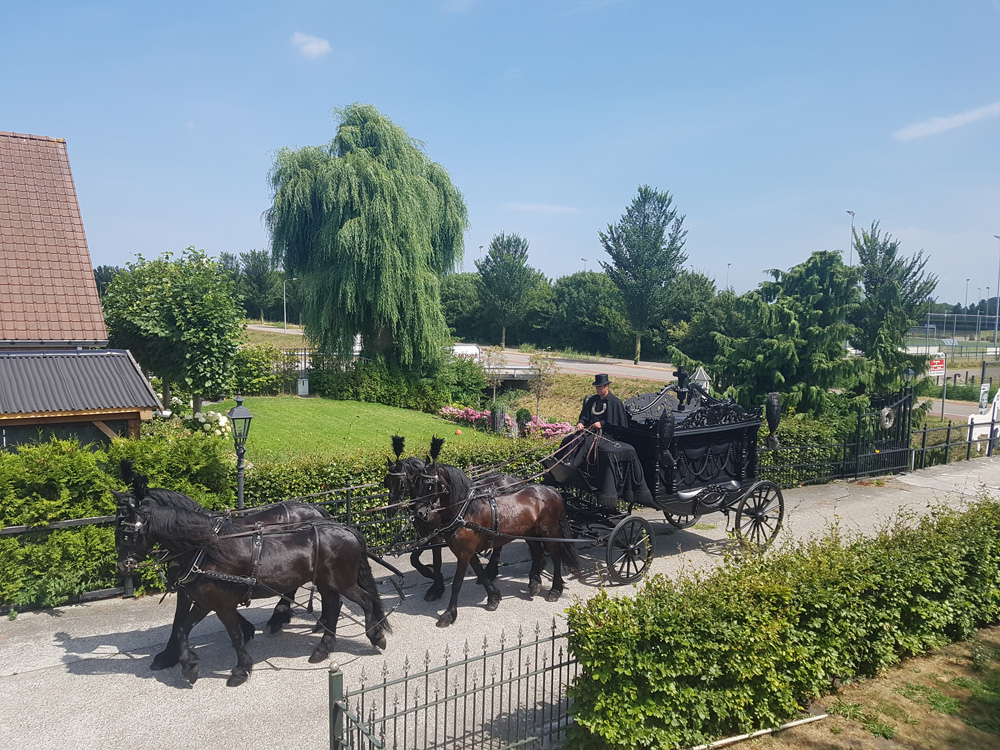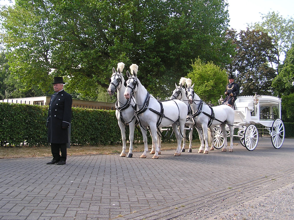 Stijlvol staatsie vervoer met een witte rouwkoets met witte paarden of en zwarte rouwkoets met Friese paarden. Jacob van den Broek uw betrouwbare partner voor rouwvervoer met paarden en koetsen www.koetsen.nl.