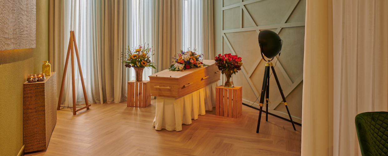 - Levering van een nette uitvaartkist (keuze tussen spaanplaat met eikenfineer of massief naaldhouten kist (eco-kist)